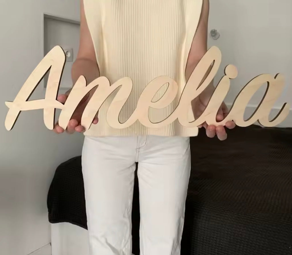 Any name or word, you choose• 11 colors + natural wood finish• 4 sizes: 35 cm | 40 cm | 45 cm | 50 cm wide• 0.73 cm thick, lightweight but sturdy• Hangs easily with command strips or standard hardware — no fuss